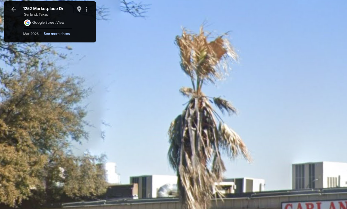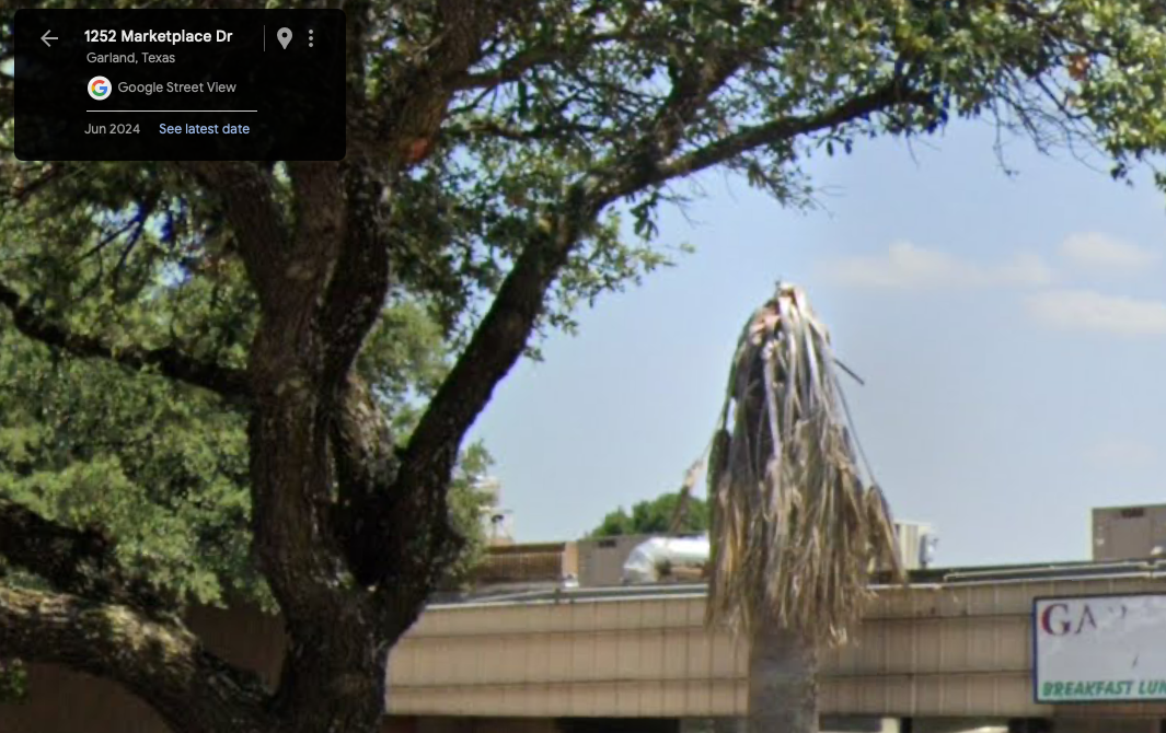 The two massive Washingtonia hybrids at Rosa's Cafe Hulen Mall Fort Worth are also still alive, although a bit fried, based on the recent street view update in March 2025. Unfortunately the street view right in front of the building isn't updated, so the second pic is what they looked Like in late 2022.