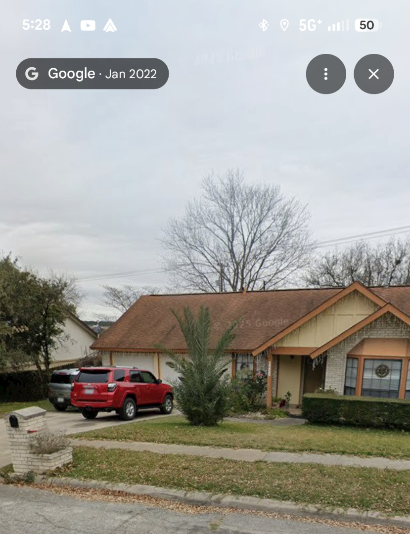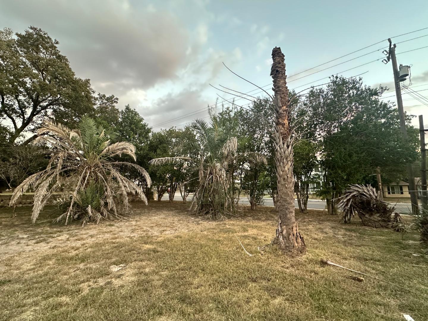 They have been in the ground since 2016 it appears. Planted from a small size. The original/main trunk of the palm closer to the driveway did survive 2021, while the one closer to the corner of the front yard looks like it lost its main trunk. It also looks like the owner was trimming suckers and maintaining them as single trunk palms prior to 2021. Not so much in the years since.