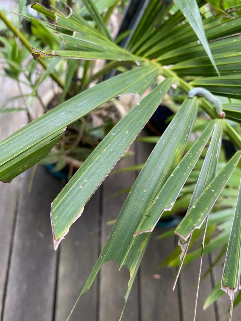 This little caterpillar if left unchecked will destroy a palm real quick hiding between leaves rolled together or two leaves pinned together by whatever means the caterpillar has it is a real pest especially on potted palms known as the palm dart grub turning into some sort of moth or butterfly a real nuisance