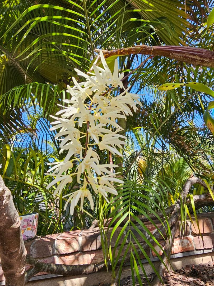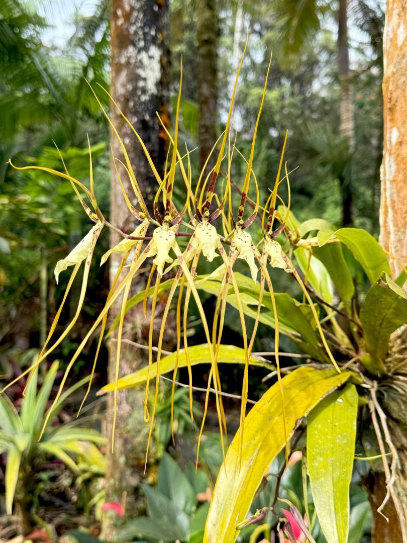 Brassia, so fragrant. You can smell the scent throughout the surrounding area. Luckily there are many tied to palm trunks.