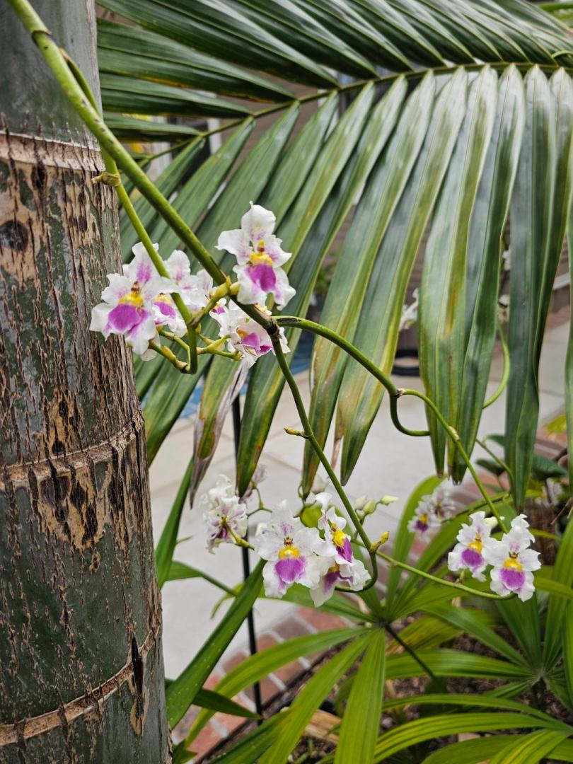 I was worried about the blossoms further out on this stem because it was hit and partially broken several weeks ago by a frond drop off my neighbor's Archontophoenix.   It just required additional patience for the buds to mature. Cyrtochilum villenaorum reposted in full bloom this time.