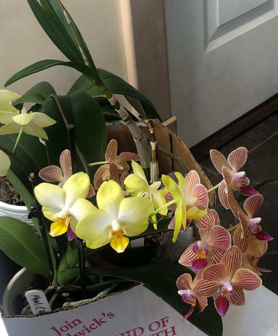 Some orchids in bloom, many just unboxed after transporting them back and forth for display in Connecticut’s recent orchid show (Nutmeg Orchid Society).