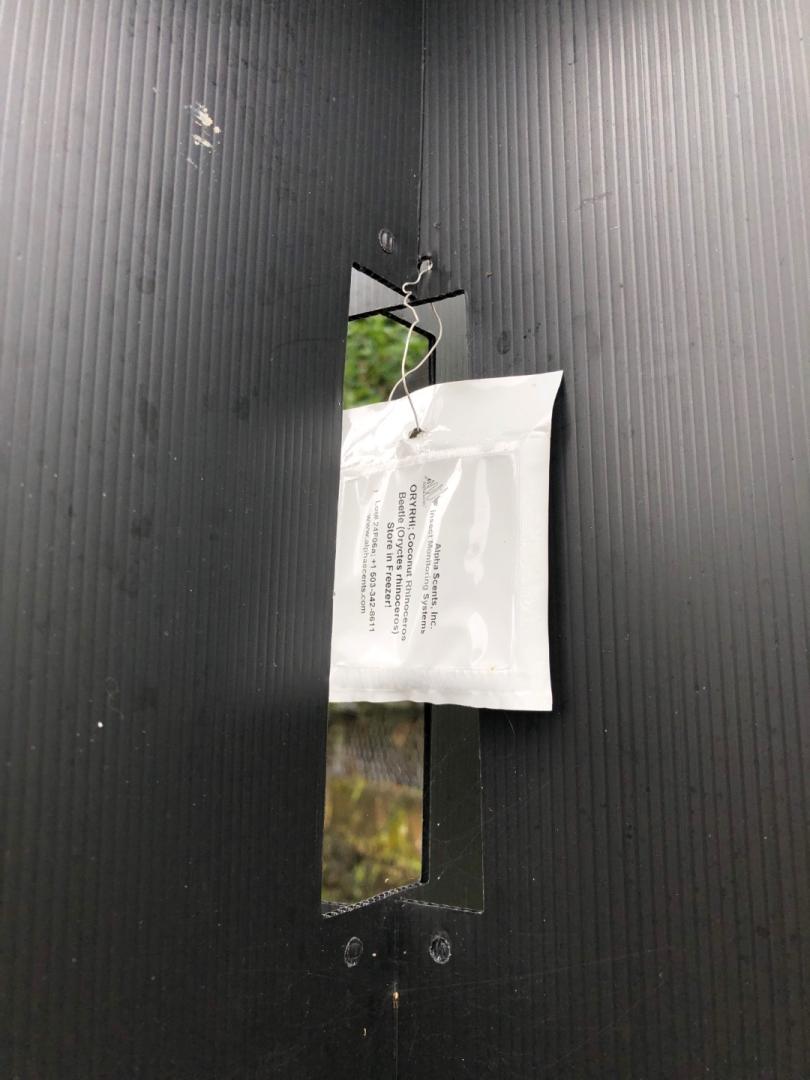 Some organization on O`ahu is expanded from 3 to 13 traps like that in Makaha Valley.  There are no palms in miles and yet they are catching CRB's.  I guess they like the forest litter.  Be careful using mulch.  They like to lay their eggs there.  There are also some piles of branches w/a small opening netting over the piles w/a lure inside.  Yesterday while hiking deep in the valley I saw one beetle caught in one.  It was still alive so I killed it w/my walking stick.   The picture was taken a few weeks ago so no beetle to show.