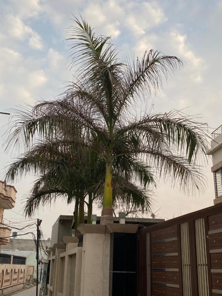 I was recently in the Punjab near Amritsar around three months back so I understand your conditions that you’re growing your palms hot and dry a good deep watering once a week should be fine or a drip irrigation system for twenty minutes every 3 days in your hot conditions in the cooler months reduce your watering keep an eye on the soil surface moisture letting the top inch dry out a bit place rock mulch around that will help with soil temperature and humidity along with moisture the small palm is a phoenix robellenii and the large could be Copernica your palms are dry tolerant ones so letting them dry out a little bit won’t hurt them palms grow slowly so a new leaf every couple of months or more they don’t grow like trees good luck and nameste or sat sri akal
