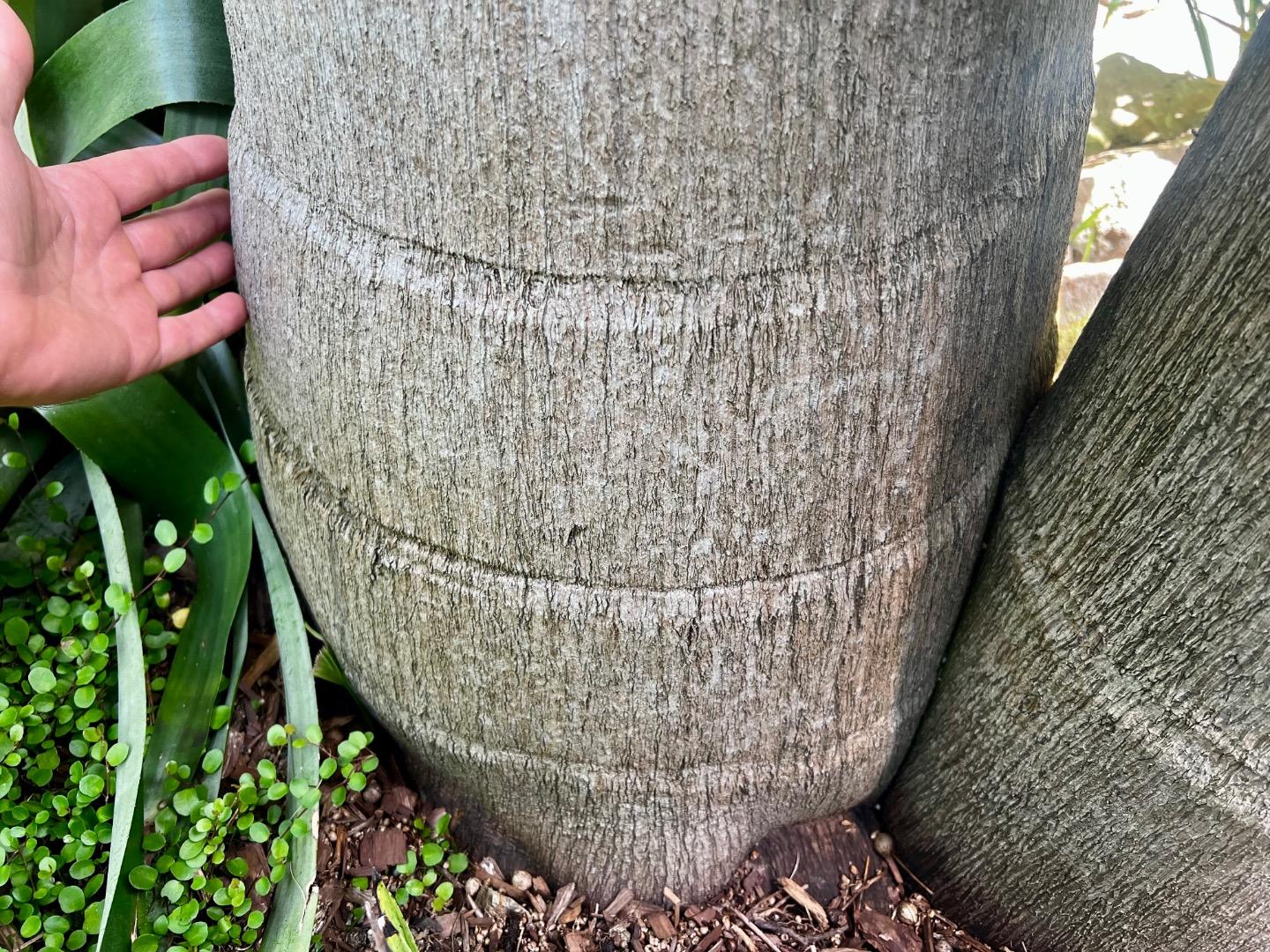 Konstantinos, Here are a few photos for reference of some Archontophoenix trunks in my backyard. The first photo is a pair of cunninghamiana and you can see the difference in the their trunk diameters. Notice also the distance between the trunk rings. They are both the same age. Photo 2 is an A. alexandrae.