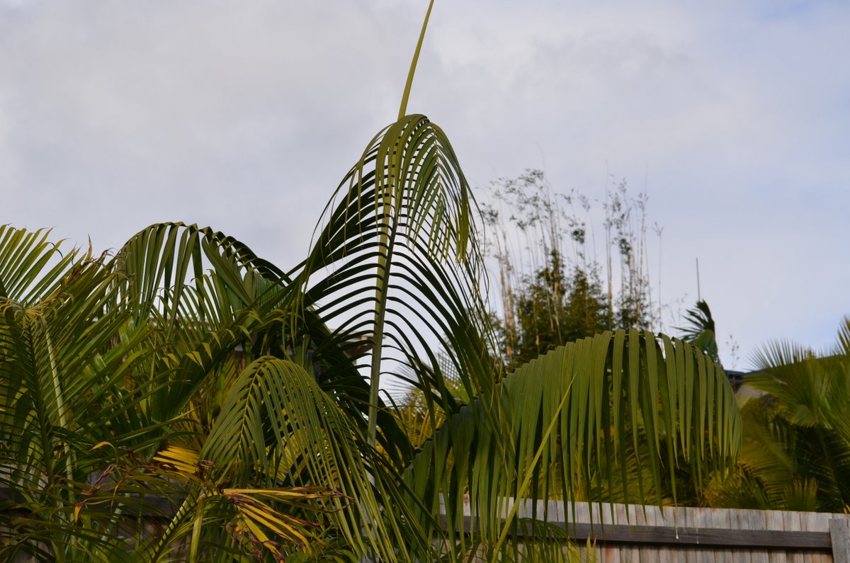 Different species guard the back fence, some lovely blue Dypsis varieties.