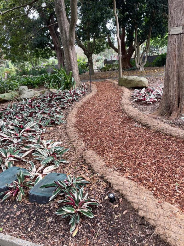 I post this view below to show the accent color and edging choice of the curved pathways that entice visitors to keep walking. I am always looking for ideas I might include on a tiny scale in my jungle.