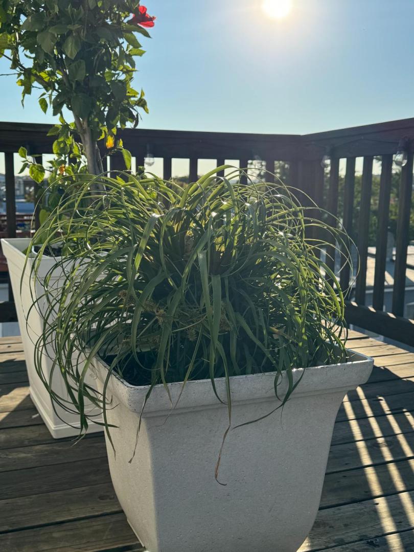 Photos here for your reference, but, after the surgery, we placed her large planter on our roof deck so that she could get full sun.  I began to apply a liquid Bromeliad fertilizer every two weeks beginning in April.  Lucky for us, we has a brutally hot and dry summer, with a stretch of nearly 3 straight weeks with upper 90's to 105 degrees, with evening temps stay in the 80's most nights.  While many of the native plants and trees were burnt or killed outright (including a young southern live oak tree that is just starting to make a come back), the Ponytail Palm thrived.  To our surprised, around two months ago I started noticing some kind of peculiar growth coming out, and extending from the new leaves.  I soon learned that our Ponytail Palm was likely flowering--something that can take up to 30 years to occur in suitable growing conditions, or, sometimes during periods of rapid growth.  We learned that if there are pink flowers, it's a female, and if there are white or yellow flowers, it's a male.  Turns out, our little girl with little yellow flowers, is actually a male.