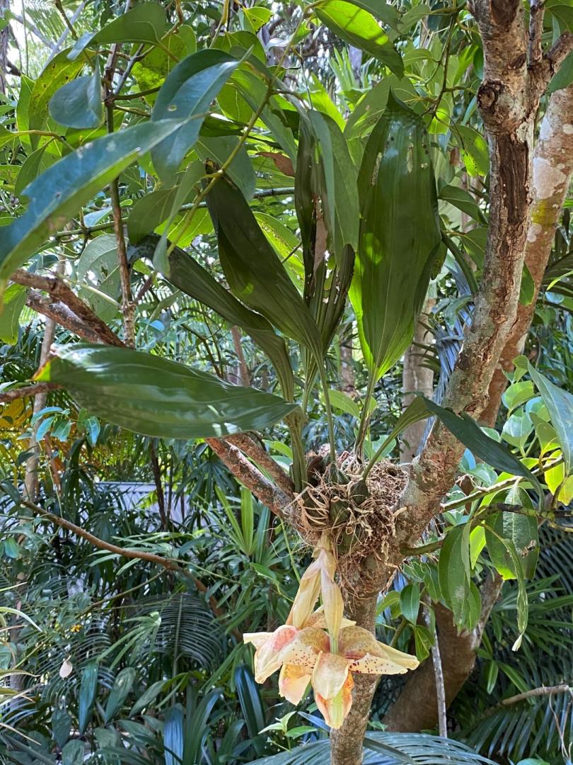I was gifted this orchid a few years ago. Being told don’t put it in container it needs a hanging basket. Iam not one for hanging baskets or a million orchids in containers so I like to put them in the garden. I put these ones where I could see them easily but also in a situation where the flower could hang upside down. The frangipani tree was a good place along with a couple of post on the side where the flower could still form. An unusual intriguing flower being produced underneath the main plant a real epithet in a true sense. While not the most spectacular flower with a lot of orchids that really steal the show this one is unique and beautiful in its own way.