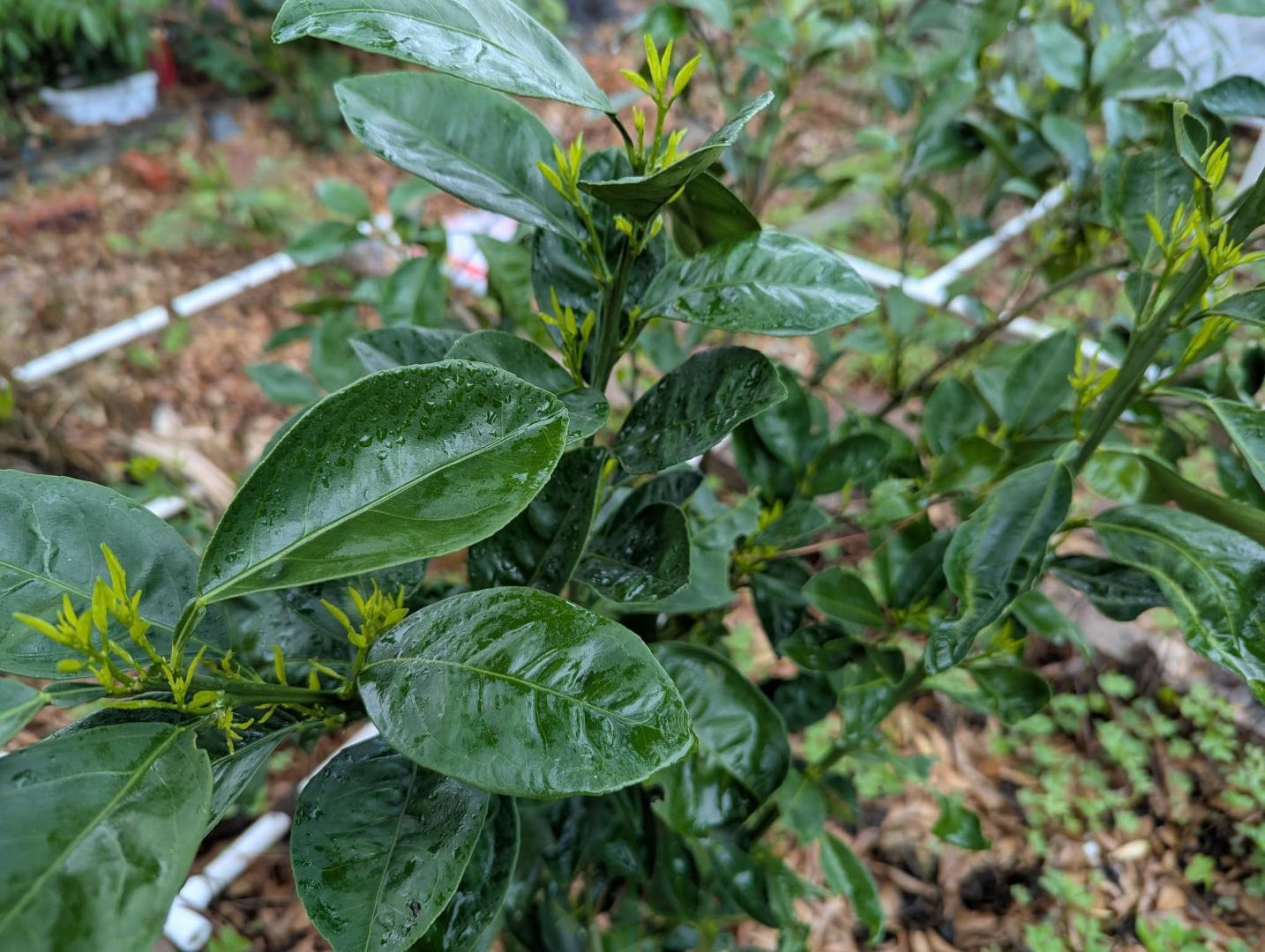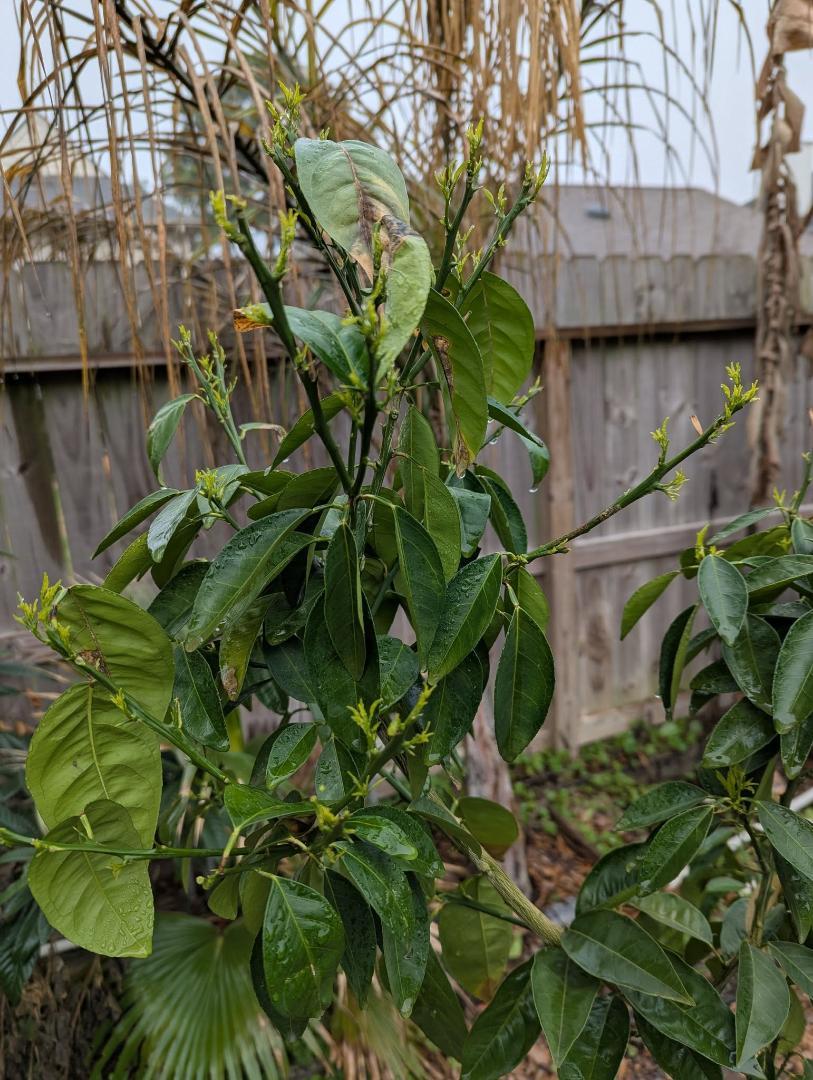 All 10 of my unprotected citrus trees are alive and most of them are putting on a huge flush of new growth. I've got satsumas, mandarin, pummelo, oranges, etc. Imo citrus is still the way to go here. Some of the ultra low chill peaches are ok. I'm not going to post 20 citrus pictures here but here are a few highlights: (you can see some queens that finally crisped up in these pics too, centers are all green and pushing)