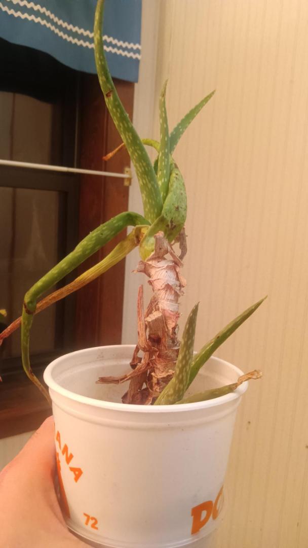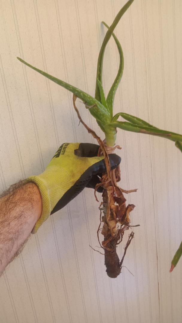 I don't know much about Aloes other than I bought some expensive ones and killed a couple and left a couple behind in TX, and I kick myself in the ass for it daily. Anyway, I was shocked that this thing is still just a stem. It was way larger and way prettier than this a year ago, so I expected it to have - you know, roots. The pot also had a plug in the bottom of it so it's never been draining.