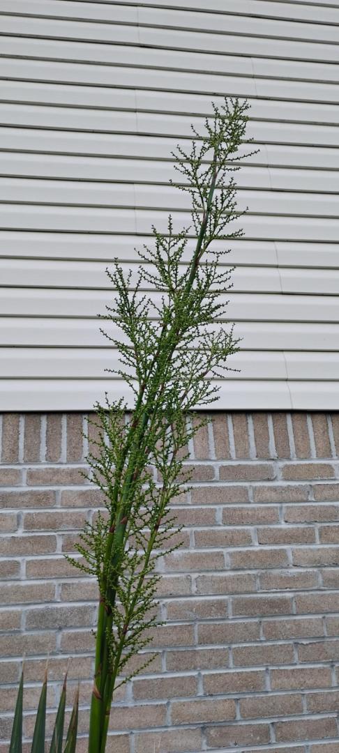 Look at the size of this bloom stalk! The tip of the tallest fronds is about 6'. The bloom stalk may be pushing 11-12' tall!