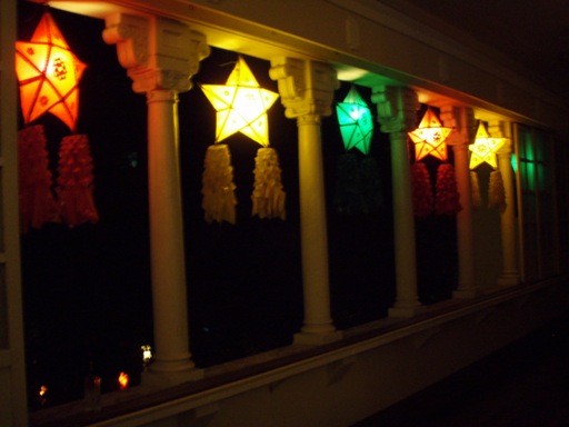 The nativity scene  (seen here) is Spanish and I think the Christmas Tree  was an American introduction.  I think the Lanterns were a homegrown concept.
