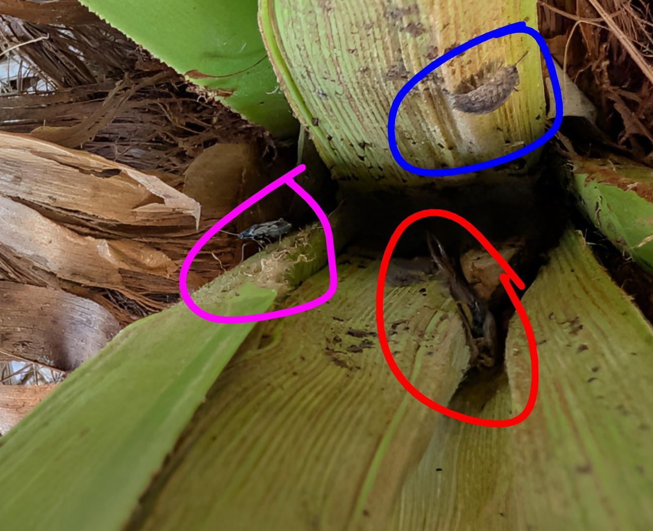 The roof of the house it is not pointing in this direction. But it's true that only now that it's planted in the ground. About 3 months ago it was in a flower pot, where there was a mess falling on it from the roof, here and there maybe some moss, etc. I picked up the larger parts, but not the small ones. Moreover, it rained extremely hard all summer here too. So it would make sense that the mess inside the palm tree is rotting, it destroys the undeveloped new leaves and at the same time attracts insects. I'll clean it up and try to move the starting leaves a little apart so that it can dry out before it rains.Thank you 🙏