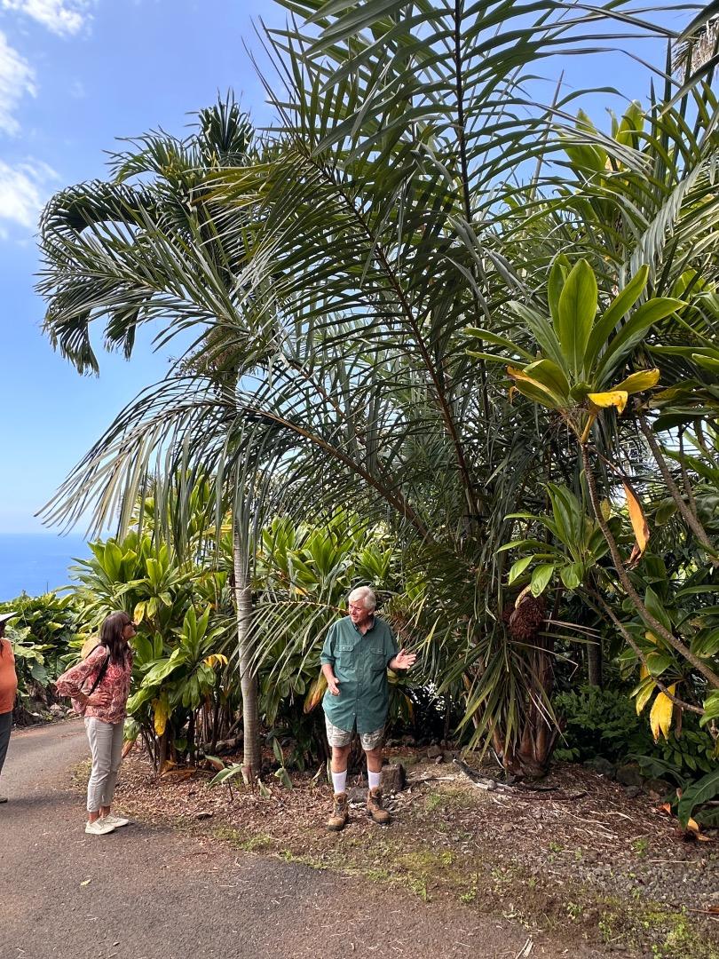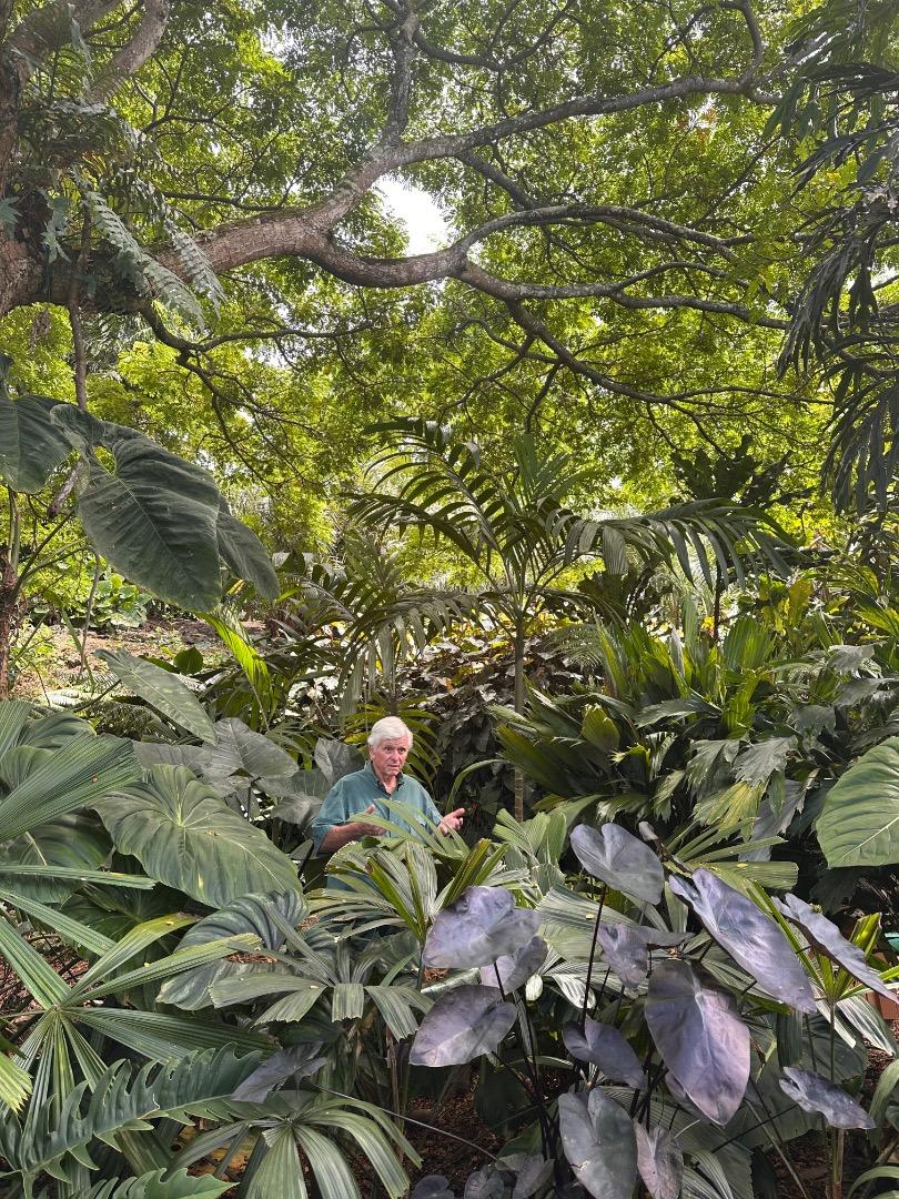 Dr. George describing his still-young Sclerosperma mannii while engulfed in luxuriant greenery, Monkey pod tree overhead.