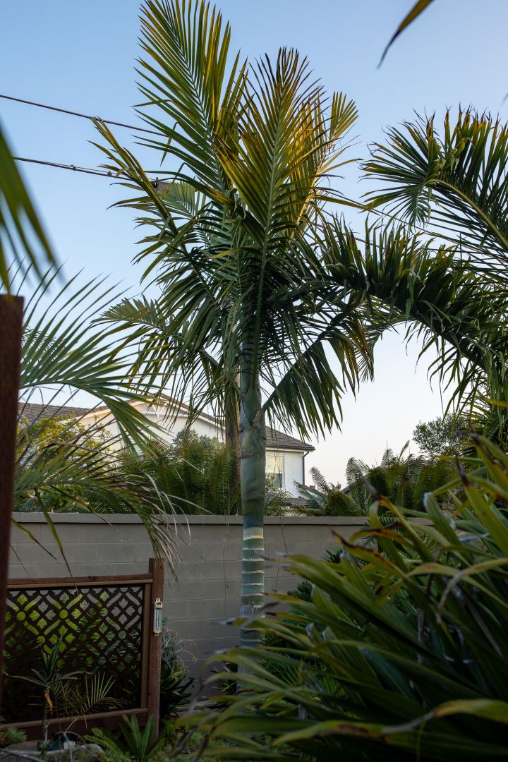 I'm not sure if it is the shade grown or other cultural reasons, but here in Southern California, once they get to trunking size they seem to hold the crown much tighter and more vertical.  Smaller ones that haven't quite trunked yet have a little lower angle to the lower fronds.  The taller one dropped it's last frond earlier in the day prior to taking the photo, but it was still held tight and erect even the evening before, so it was a bit of a surprise to come out and see it down.